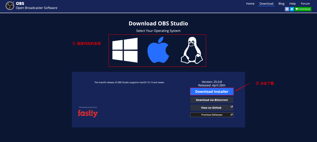 A:登入https://obsproject.com/download,选择对应系统点击蓝色按钮下载安装程序。